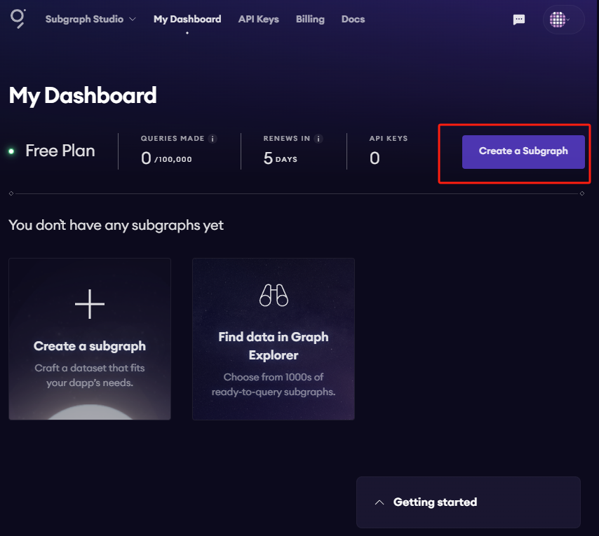 In Subgraph Studio, you’ll see the “API Keys” menu at the top of the page. Here you can create API Keys.