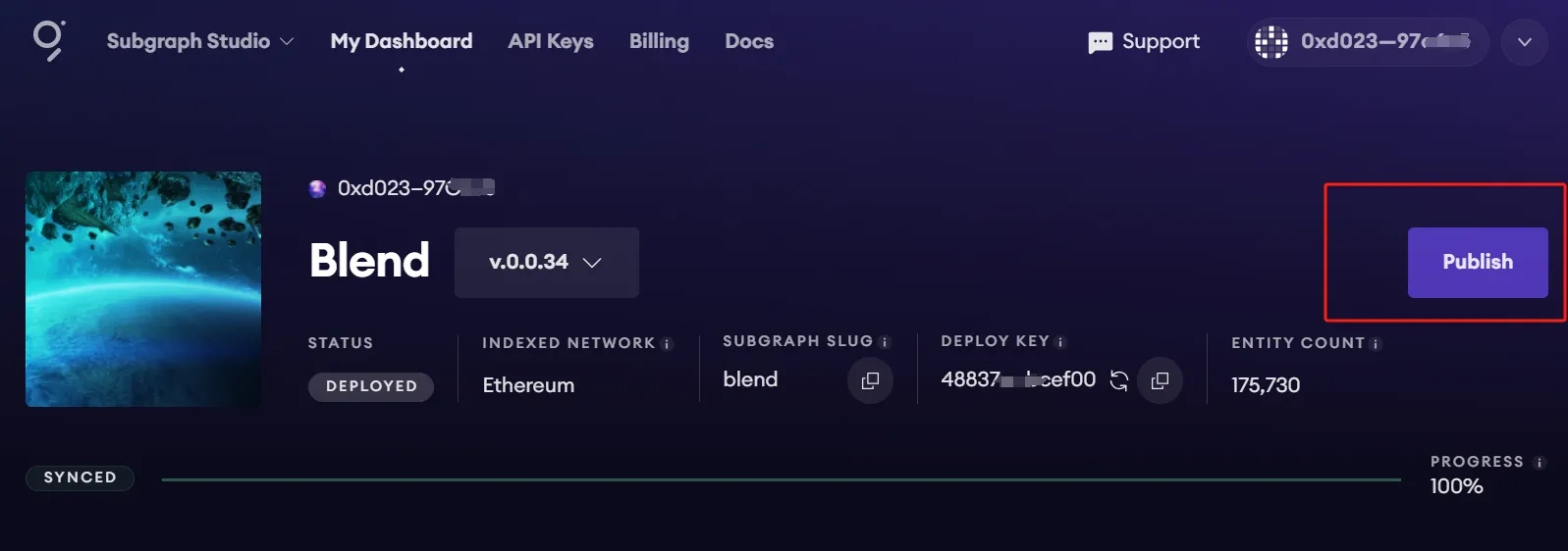 Once your subgraph is ready to be put into production, you can publish it to the decentralized network. On your subgraph’s page in Subgraph Studio, click on the Publish button: