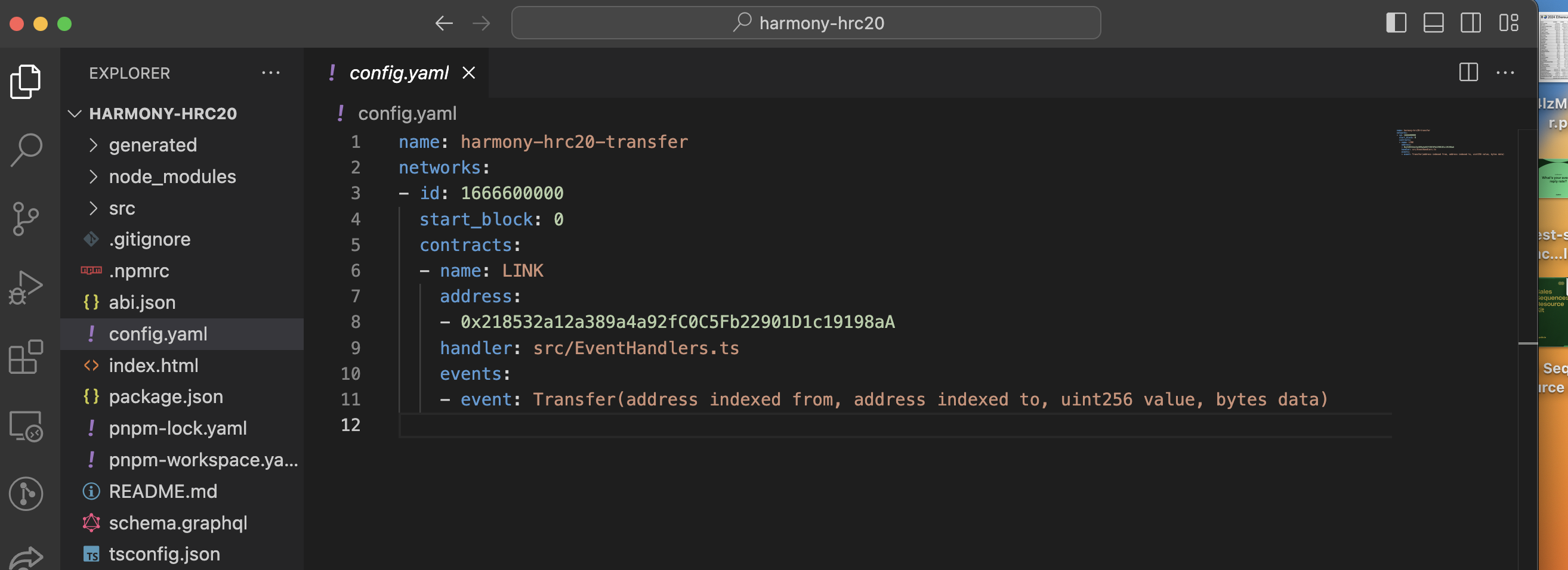 This file defines the network, start block, contract address, and events we want to index on Harmony.
