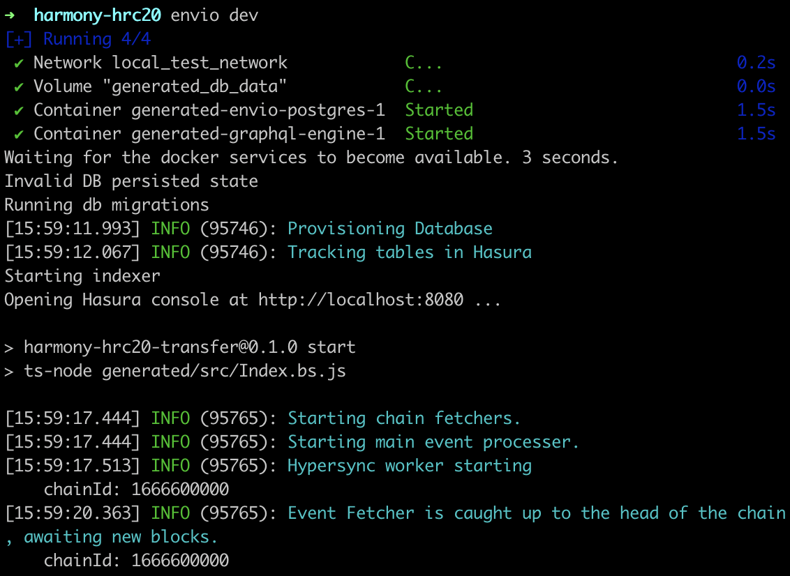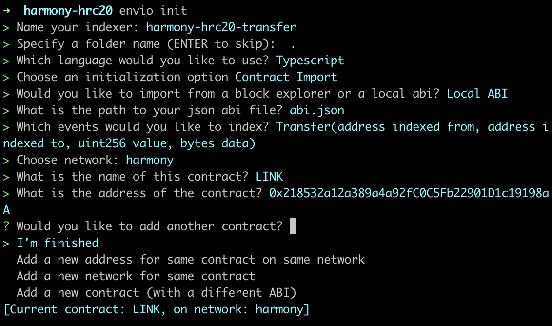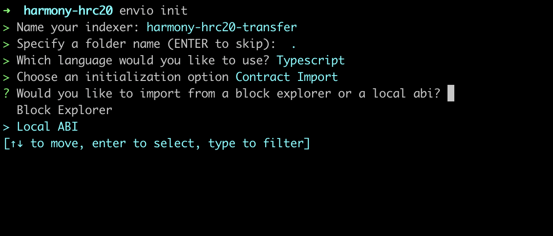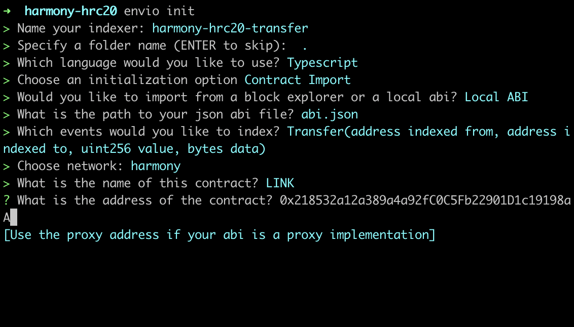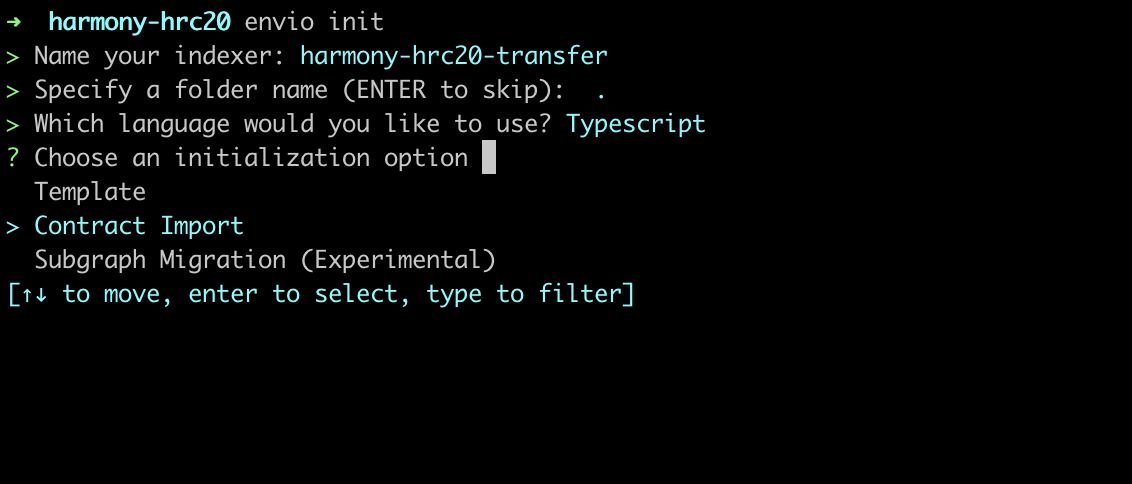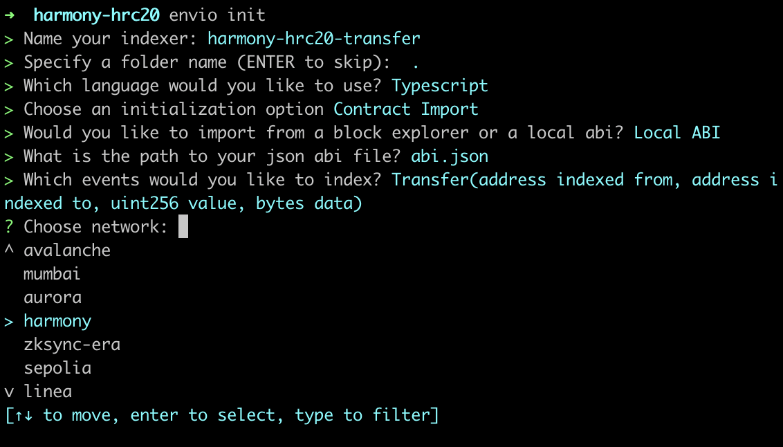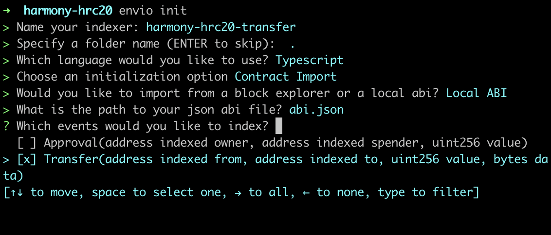 Now that you’re all set up and have installed the prerequisite packages required, let’s jump into the practical steps of initializing the indexer and generating a boilerplate index to index the largest LINK token transfers on Harmony.