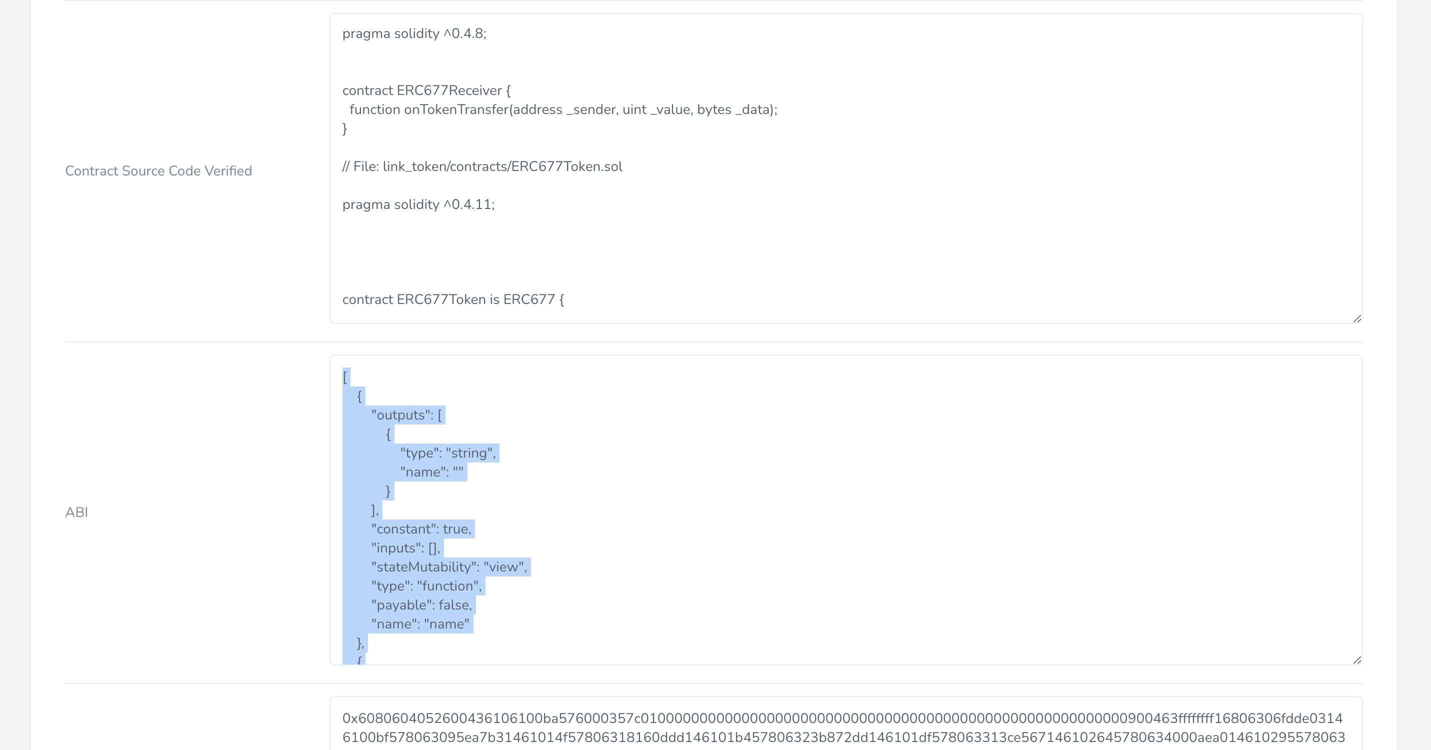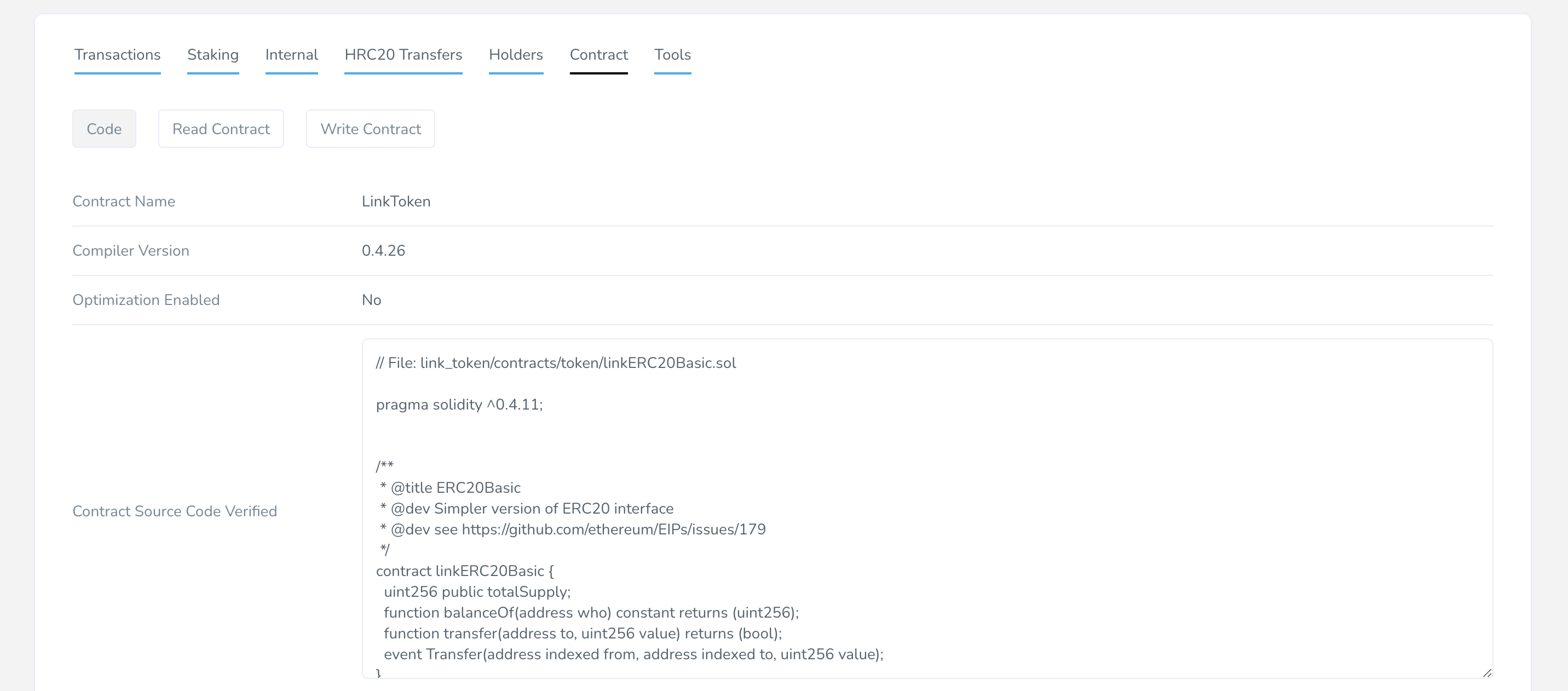 4. Head over to the [Harmony Explorer](https://explorer.harmony.one/), and save the ABI code from the LINK smart contract address as a file in the current working directory. For this demonstration, we've chosen to name the ABI file "abi.json". Specify the directory of JSON file containing ABI, for example `abi.json`.