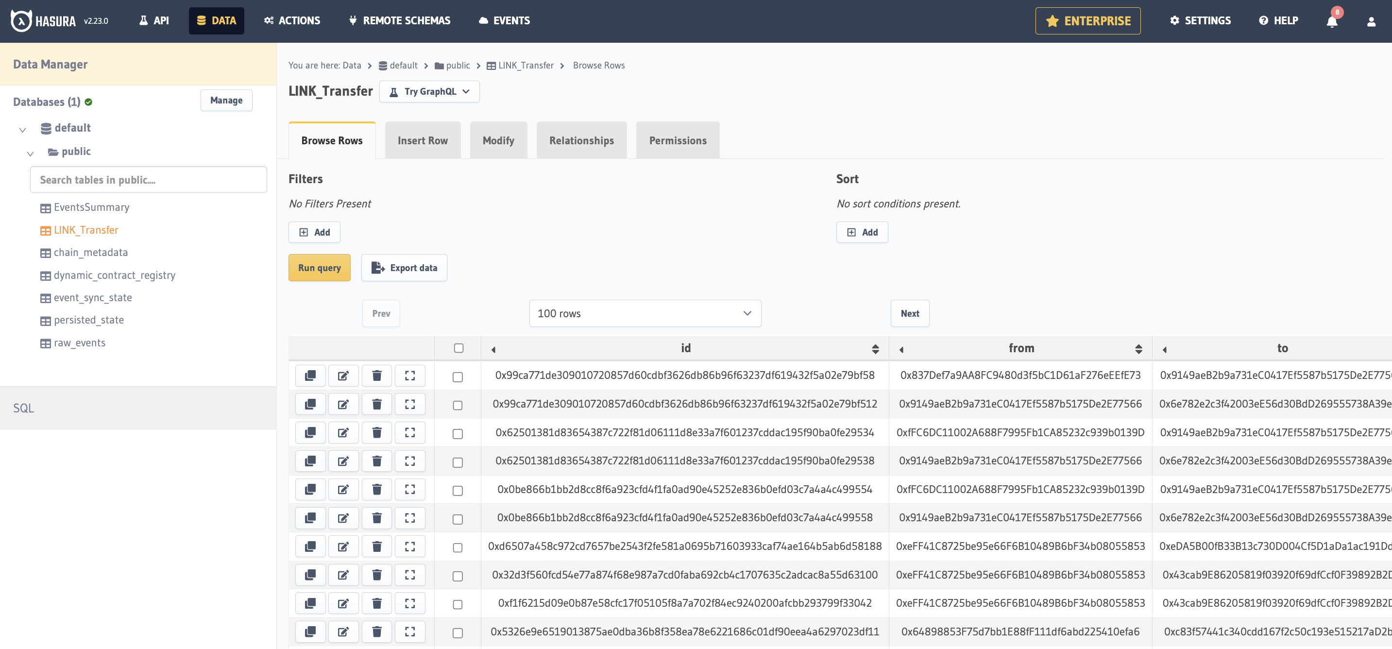 Well done, now let’s explore the indexed data. Your browser would have opened a local Hasura console at <http://localhost:8080/console>