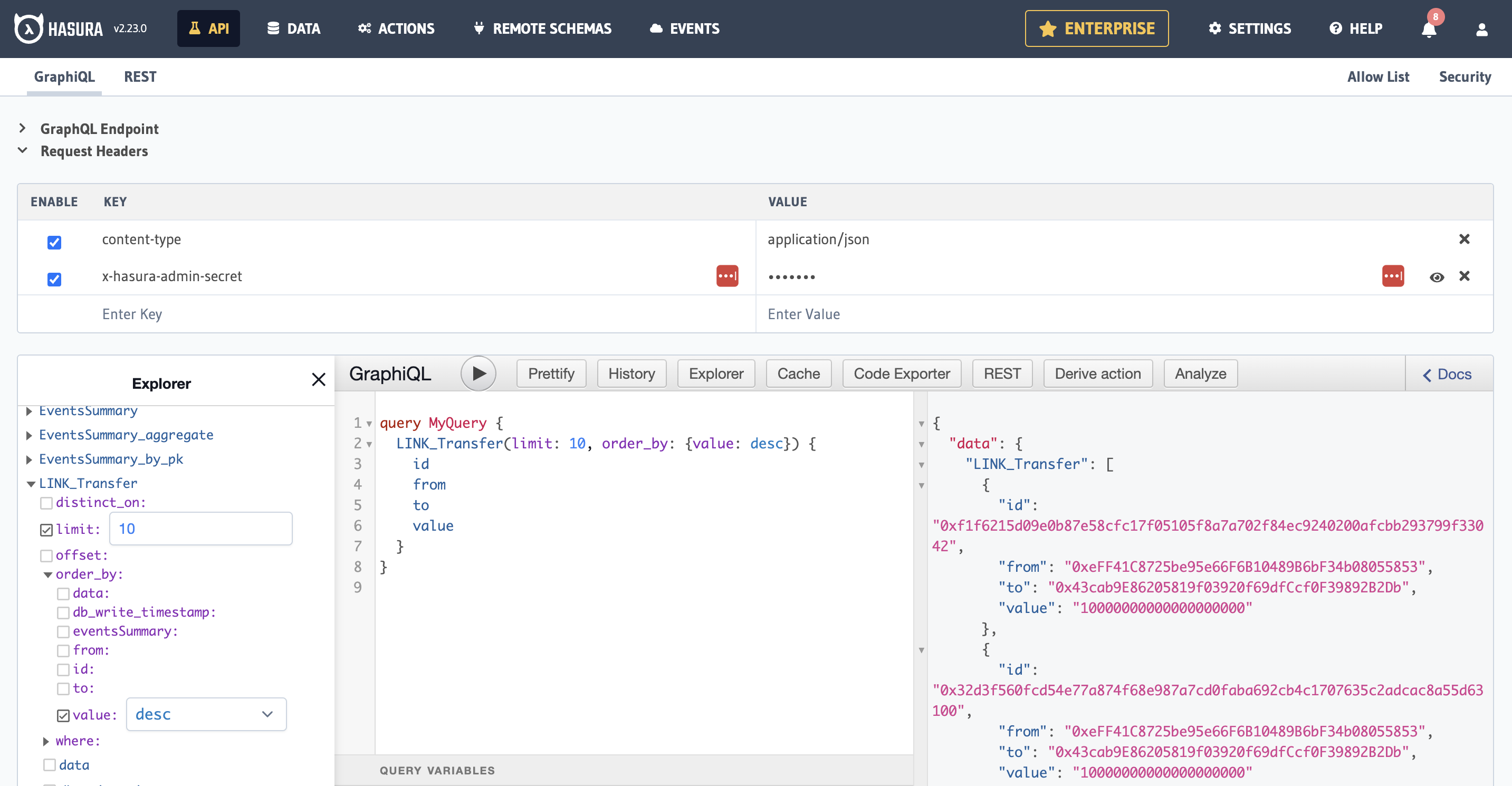Let’s look at getting 10 `Link_Transfer` events, and order them by the amount we would like to appear first (in this case: desc = largest amount), who it’s from, who it’s to, and the value being transferred.