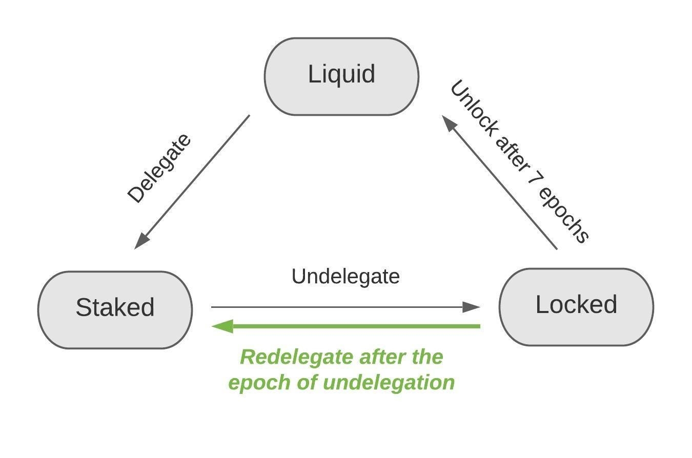 Specifically, if stakers want to redelegate X tokens from validator A to validator B, they can first undelegate the X tokens from validator A and the tokens will be locked immediately. After the end of the epoch, they can send a delegate transaction with X tokens to validator B and the locked tokens will be immediately unlocked and used for the new delegation. Alternatively, If the delegation amount is greater than the locked tokens that’s available for redelegation, the liquid tokens will be used to fill the difference.